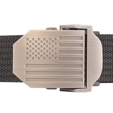 Constructed with tough 100% nylon webbing reinforced stitching Durable metal buckle Embossed American Flag design Latching mechanism to secure belt...